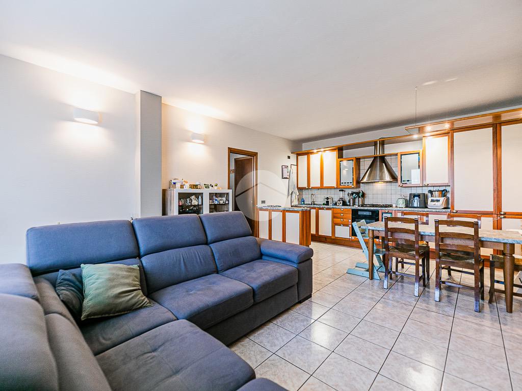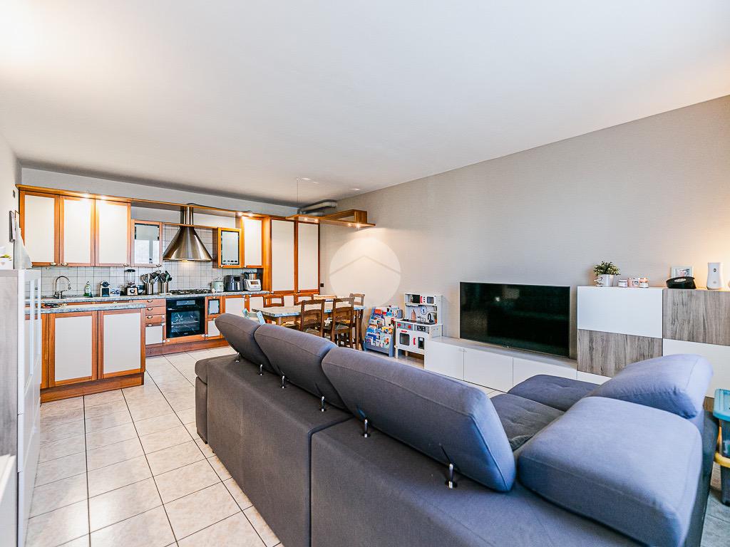 L’ingresso si apre su una luminosa zona giorno open-space con cucina a vista, pratica e ben organizzata.